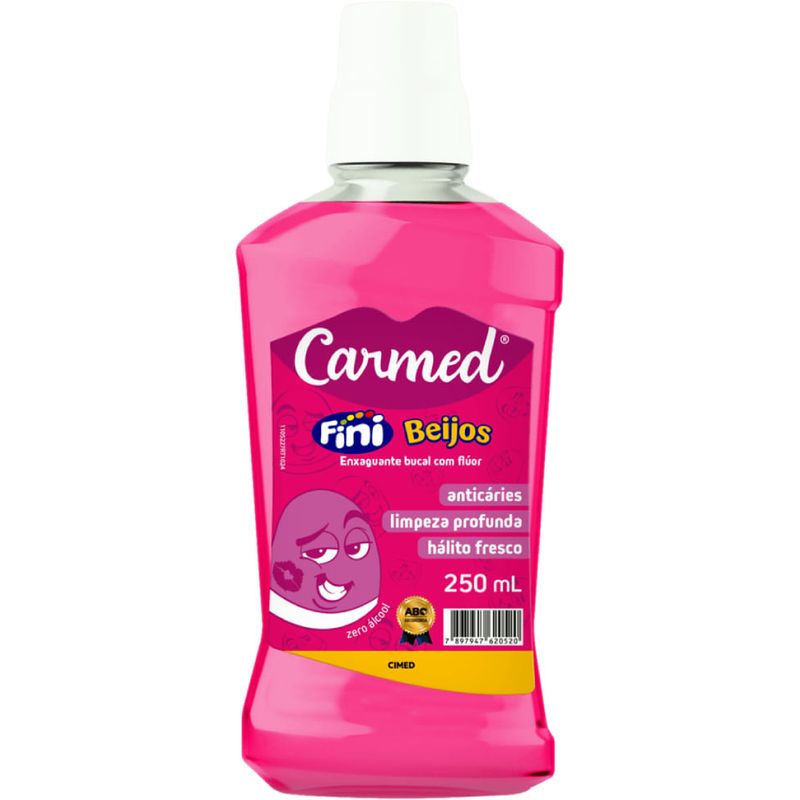 Desfrute de uma higiene bucal completa e um hálito fresco com o Enxaguante Bucal Carmed Fini Beijos, formulado para proteger contra cáries e sem álcool.